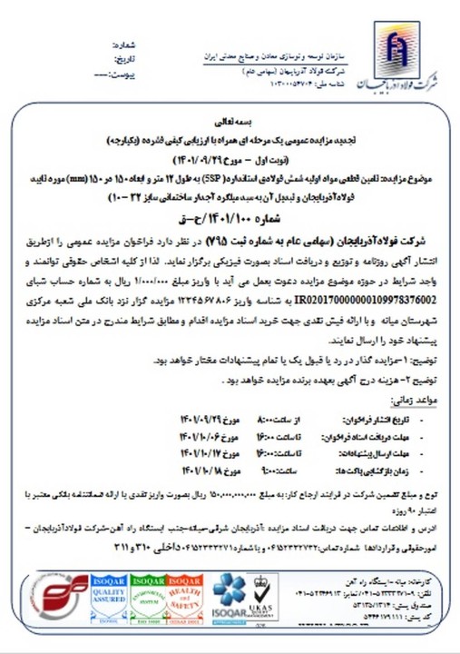 فراخوان مزایده عمومی شرکت فولاد آذربایجان
